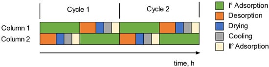 Further experiments performed using this system are proposed to be conducted in a TSA mode. Such an adsorption system should consist of two columns working interchangeably in a cycle consisting of 5 steps: adsorption, desorption, drying, cooling, and finally the second stage of adsorption. In the fifth step of the cycle, the second column is used in series, after the first adsorber, and thus acts as a second-stage reactor. Thus, for a portion of the cycle, such a setup could operate with two columns in series, while for the rest of the time the adsorption process would remain single-stage. To operate the system continuously as two-staged adsorption, a third column would be needed. Schematic diagram of the TSA cyclic operation is shown in Figure 5.