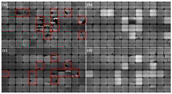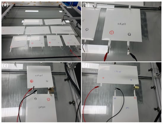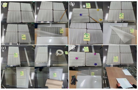 Figure 5 shows the process of repairing by replacing some cells of the module. Figure 5a depicts the removal of some cells from the existing module. Only half of the module was manufactured, and the lamination was performed. EVA interface of the module and windshield were cleaned with alcohol. Flux was applied to the remaining rear bus bar. The cells to be replaced were connected as shown in Figure 5b. The first EVA sheet was inserted into the front of the replacement cell. The second EVA sheet was placed on the back and fixed so that it did not move. Figure 5c shows that the entire back of the repaired module was covered with EVA and back sheet to finish. Figure 5d shows the module in which the process shown in Figure 5c was finished and the sample was laminated once again. It showed a well-restored result in appearance without bubbles or discoloration at the interface. This method follows the method of restoring the module after replacing the cell in the previous study. Half of the repaired and restored module went through the lamination process only once. The existing area went through two high-temperature lamination processes. To test the long-term reliability of this part, a damp heat 1000 h test was performed [,,,]. Other samples and controls were also tested for long-term reliability due to output deviation. The initial output and the output decrease after the test were compared. Differences from losses due to electrical mismatch and long-term reliability test results are discussed in the Results and Discussion section.