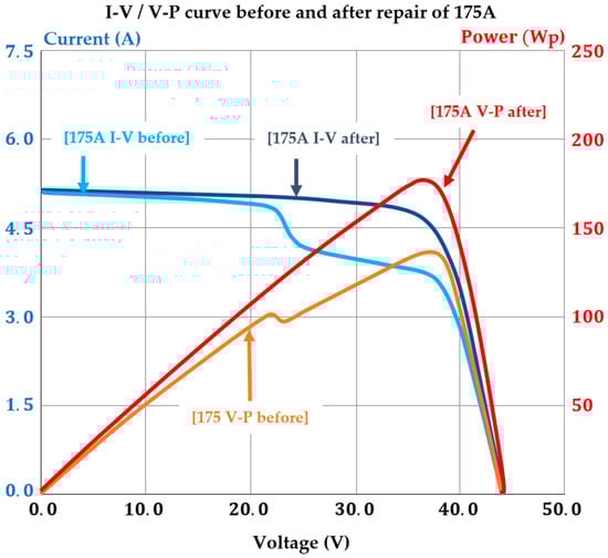 Three factors must be inferred from the above results. First, it is necessary to find out the output of cells by using which the module was manufactured when 175A and 175B samples were commercially produced. Even for the initial model, there is a tolerance of ±3%. In fact, it is most accurate if there is data for each individual module. However, it is a model that has already been produced for more than 10 years, and there is no output data left at the time of production. It is assumed that the electrical characteristics of the module disclosed on-line by the manufacturer are the initial characteristics of the module. Figure 2 shows the I-V and V-P curves before and after repair of the 175A module. The IV curve of the cell-in-hotspot module falls in a stepped shape. The slope of the step is proportional to the degraded output. The V-P curve also shows two or more typical multi-peaks. This is caused by a cell-in-hotspot in the cell string that lowers the short circuit current (Isc) of the cell and increases the resistance.