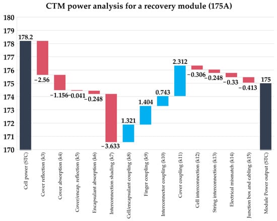 The loss value due to electrical mismatch of the cell was obtained by excluding the annual output decrease rate and initial tolerance from the theoretical value was analyzed [,,]. In order to obtain the initial tolerance of the cell, the next additional experiment was performed. The electrical mismatch index of k14 cell is applied to the mismatch of cells already sorted within ±3% when the module was initially manufactured. It should be noted that this is different from mismatch in the range of 3% or more. In general, the annual output degradation rate guaranteed by the module manufacturer is 0.7%/year. This figure is the guaranteed limit for power generation loss due to the failure of some modules in the power plant. In fact, the figures published in the previous study [] show that 80% or more of crystalline solar modules that have been in operation for more than 10 years only deteriorate by an average of 0.27%/year. However, the actual output degradation is much less. The total decline rate was calculated elsewhere and applied instead of the annual rate. The long-term output degradation rate may vary depending on the type and efficiency of the cell. In this paper, this value was applied and calculated. The output deviation between the replacement cell and the initial cell is 2.9 Wp − 2.48 Wp = 0.42 Wp. This figure represents a mismatch of about 16.94% compared to the output of the existing cell. The sum of the initial total output of the 175A sample in which 12 cells were replaced is 178.15 + (0.42 × 12) = 183.19 Wp. The sum of the initial cell output of the 175B sample is 182.77 Wp. The expected output of the module considering the CTM factors is 179.95 Wp for 175A sample and 179.53 Wp for 175B sample as shown in Table 4. The long-term degradation of 60 cells without replacement in the 175A sample was 2.48 Wp × 60 × 0.27% = 0.4 Wp. The expected output considering the long-term output degradation of the 175A sample is 179.55 Wp. The long-term output decline of the initial 61 cells of 175B is 0.41 Wp, and the expected output is 179.12 Wp.