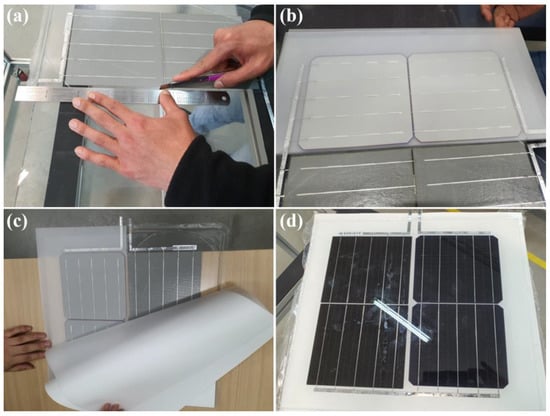 Figure 4a was prepared with 4 cells of 5.4 Wp for the control group. This sample was named S1. Figure 4b shows that 3 sheets of 5.4 Wp and 1 sheet of 5.7 Wp cell were mixed. This sample was named S2. Figure 4c was designed to produce 2 sheets of 5.4 Wp by mixing with 2 sheets of 5.7 Wp. The sample was referred to as S3. The sample S3 was produced by a slightly different process. The description of the subsequent manufacturing process of the sample S3 will be described as shown in the following Figure 4c. Figure 4d is produced by mixing 1 sheet of 5.4 Wp with 3 sheets of 5.7 Wp and it is called sample S4. Cell mismatch was tested by fabricating modules with cells that had different outputs. All samples from S1 to S4 used the same 4.0 mm low iron tempered glass. There is no deviation due to use of the same Ribbon, EVA, and back sheet. The only factors affecting the output of the module are the sum of output of each cell and the loss due to mismatch. The difference between the sum of the calculated outputs and the experimental results will be dealt with in the following Results and Discussion section. Figure 5 shows the subsequent manufacturing process of the sample S3.