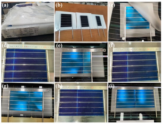 When the deviation of the cell output was 17%, the decrease in the output of the module was not large. A wider range of experiments was needed. It is impossible to simultaneously obtain cells where the output deviation of individual cells is 25% to 100%. Cells of the same grade were cut and connected in parallel to fabricate unit cells showing various outputs. Figure 6 shows the manufacturing process of unit modules with various output deviations used in the experiment.