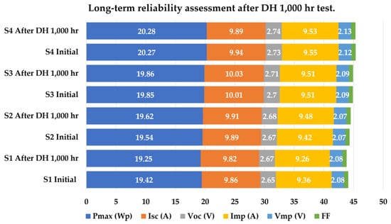 Figure 8 shows the comparative analysis of the results in Table 6. The sample S1 consists of 4 5.4 Wp sheets, and the sum of cell output is 21.6 Wp. The actual output value is 19.42 Wp, and the CTM of this equipment corresponds to 89.91% of the sum of the cell output values. The predicted value of the S2 sample is calculated as 21.90 Wp × 89.91% (CTM value) = 19.69 Wp, which is the sum of the cell outputs. The difference from the actual output value is 0.15 Wp. This shows a deviation of 0.76% from the predicted value. The sum of the cell outputs of S3 and S4 samples is also 22.20 Wp and 22.50 Wp. Moreover, 19.96 Wp and 20.23 Wp, which correspond to 89.91%, are predicted values. Even in this case, the difference from the measured value is only 0.55% and 0.18%. There is no initial tolerance and no long-term output degradation. The only factor that affects the cell output is the output degradation due to the electrical mismatch of the cell. The output deviation shown with yellow line in Figure 8 does not show a specific pattern with only −1% to +1% difference. As a result, no effect was found on the output of the module in the electrical mismatch of individual cells of 5.56%. Next, the effect of the electrical mismatch of the cell and the number of high-temperature laminations of EVA in the module repair process on the long-term reliability of the module was analyzed. For the analysis, the output degradation was observed after performing the DH 1000 hr test on the S1~S4 modules used for the output test. Table 7 shows a comparison of the output of samples S1~S4 before and after the damp heat 1000 hr test.