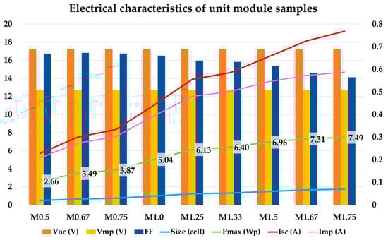 The unit module samples measured were combined. Various ratios of electrical mismatch were made and tested. In this experiment, unit module samples were manufactured by combining different areas using cells of the same grade. The mismatch ratio was determined by calculating the area ratio of the cell as the mismatch ratio. The ratio was calculated based on the difference between the small cell and the large area cell. That is, the mismatch ratio between 0.5 cell and 1 cell was calculated as (1 − 0.5) ÷ 0.5 = 100%. The predicted output is the arithmetic sum of the outputs of each unit module summarized in Table 8. The output of M0.5 + M1.0 sample is 2.66 Wp and 5.04 Wp. The sum of these two values is 7.70 Wp, and the estimated value is 7.7 Wp. All combinations of such parts were equally applied as measured values by connecting two unit modules in series. It does not significantly affect the overall trend. Table 9 summarizes the experimental results with different mismatch ratios based on a small area unit module of less than one cell.