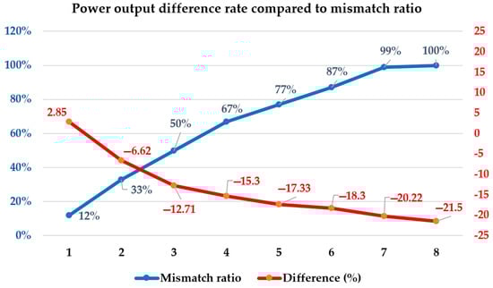 Figure 11 shows the slope change in electrical mismatch ratio around 50%. This area is the inflection point. The area increases based on 50%, which means that the output does not increase. Table 11 summarizes the experimental results with different mismatch ratios based on unit modules of one cell or more.