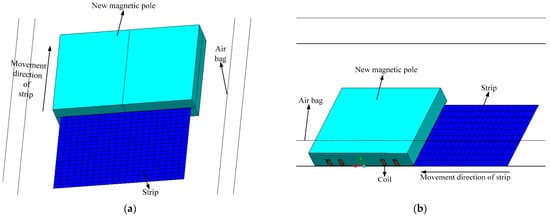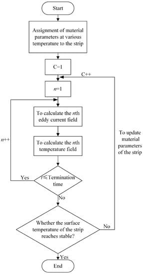 The calculation ends when the relative difference between the two is less than 1%. When the relative difference is more than 1%, the above method is continued to calculate the magnetic–thermal coupling, which realizes the continuous movement of the strip and material parameters changing with temperature.