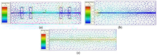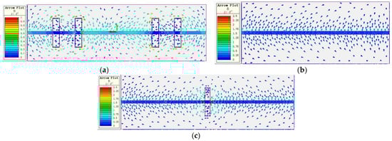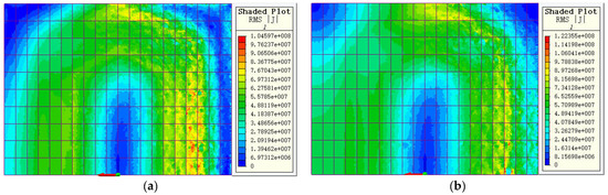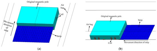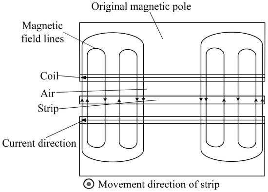 Figure 10, the eddy current distribution on the strip surfaces of the two models follows ‘the law of coil projection’, whereby the eddy current distribution on the strip surface is concentrated in the positive projection area of the heater coil on the strip surface. The eddy current distribution of the two models also satisfies that the eddy current value of the strip surface at the outlet of the heater is lower than that at the inlet of the heater. During the heating process, the strip moves continuously, and the strip moves from the heater inlet to the heater outlet, and the surface temperature of the strip rises continuously. The magnetic conductivity and electrical conductivity of the strip decrease with increasing temperature. The eddy current value on the strip surface is positively correlated with the magnetic conductivity and electrical conductivity of the strip. Therefore, the eddy current value on the strip surface at the outlet of the heater is lower than that at the inlet of the heater.