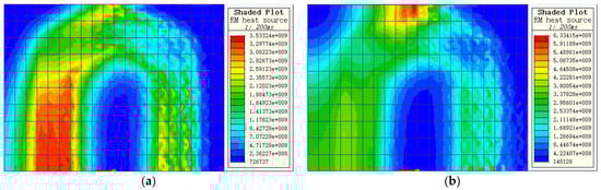 Figure 11, the heat source distribution on the strip surface of the two models is similar to that of the eddy current distribution, and they both follow the law of coil projection. It is also observed that the distribution of heat sources on the surface of the strips of the two models satisfies that the value of heat sources at the outlet of the heater is larger than that at the inlet of the heater. The temperature of the strip surface and the heat source affect each other during the heating process, and the surface temperature of the strip increases from the heater inlet to the heater outlet, and the electrical conductivity of the strip decreases with the increase in the temperature, and the degree of decrease with the increase in temperature is greater than that of the eddy current value on the strip surface. The relationship between the Joule thermal power per unit volume of heated strip and the surface eddy current and electrical conductivity of the strip is