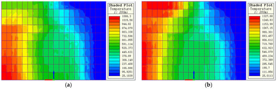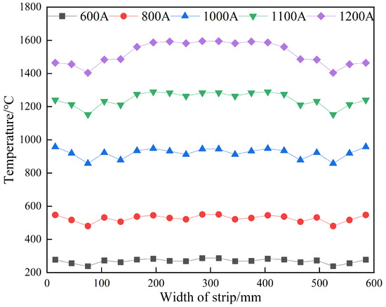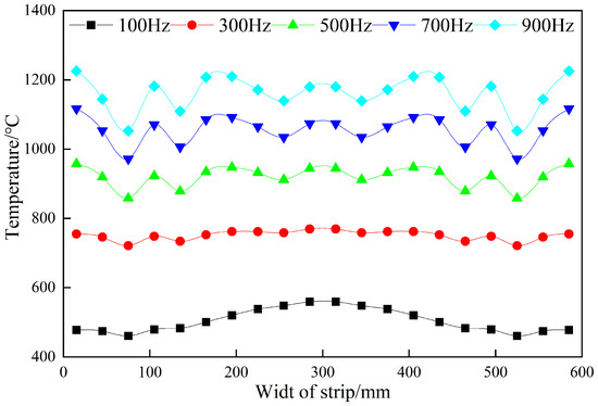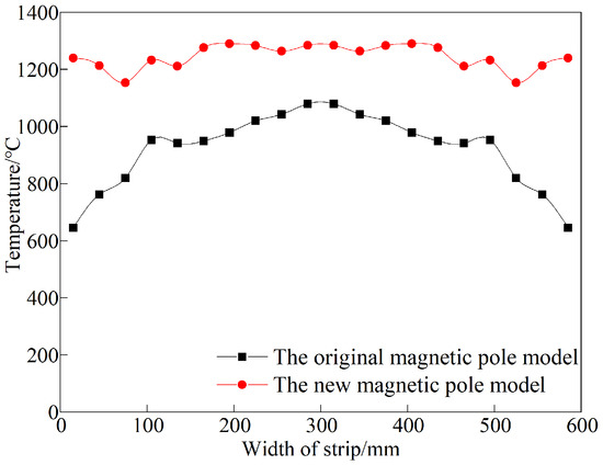 Figure 13, the temperature on the strip surface of the two models increases continuously with the movement of the strip from the heater inlet to the heater outlet. Meanwhile, the temperature distribution of each part of the strip surface is smooth due to the heat transfer. Due to the convection and radiation heat dissipation between the strip edge area and air, the temperature of the strip edge area is lower than that of the middle area, resulting in poor uniformity of the temperature distribution of the original magnetic pole model. Due to the multiple effects of “edge effect of electromagnetic field” and new magnetic pole structure, the temperature in the edge area of the strip is close to that in the middle area of the strip, which makes the temperature distribution at the outlet of the heater more uniform in the new magnetic pole model.