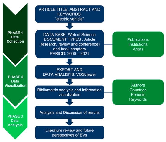 Initially, a search was carried out in the WoS database and the evaluation of the obtained documents was divided into three phases (Figure 1): (PHASE 1) definition of search criteria to identify records in the WoS database and refinement of retrieved records (data collection phase); (PHASE 2) the documents were exported to the VOSviewer software for bibliometric analysis of publications, authors, countries, institutions, journals, and areas (data visualization phase); and (PHASE 3) data analysis to identify the main themes discussed in research developed about EVs.