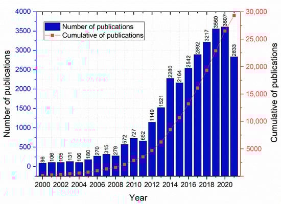 Quantitative distribution of publications in electric vehicle studies, 2000–2021.