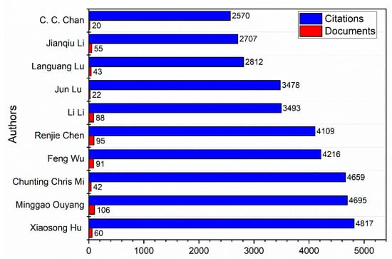 Regarding author analyses, from a total of 60,053 authors who have published on the theme of electric vehicles, only 3754 (6.25%) have five or more documents linked to their names. The top 10 authors based on the number of citations and documents are presented in Figure 3. The most cited author was Xiaosong Hu with 4817 citations and 60 documents, followed by Minggao Ouyang and Chunting Chris Mi. Xiaosong Hu has been working in research involving modelling and control of alternative motors and energy storage systems. Another interesting fact is that among the ten main authors, eight are linked to Chinese institutions, corresponding to 80%.