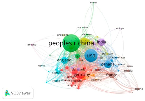 Figure 4 shows a semantic network of published documents by country. As can be seen in the distribution, the People’s Republic of China is the country that most publishes about EVs, with the production of 9138 documents (31.18%), followed by the USA with 4843 documents (16.52%) and by India with 1777 documents (6.06%). China’s leadership can be explained by the incentives that the government has been promoting since 2005 for studies on and the development of the EV market [32]. These include, for example, subsidies to make the purchase viable, investment in charging stations, parking, and low cost of electricity. All of these incentives resulted in the growth of the EV market in China [33].