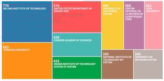In terms of research centers that were involved in the works, this study identified 8690 institutions that participated in the publications. The 10 main institutions with the largest number of documents published on the topic EVs are structured hierarchically in the TreeMap in Figure 5. The size and color represent the separate numerical dimensions of the data. As expected, among the top 10 institutions, five are located in the People’s Republic of China. The two institutions that published the most are the Beijing Institute of Technology, with 770 documents (2.62%), and Tsinghua University, with 683 documents (2.32%). They are followed by the United States Department of Energy (DOE) of the USA with 576 documents (1.96%). These data corroborate the results presented in Figure 4.