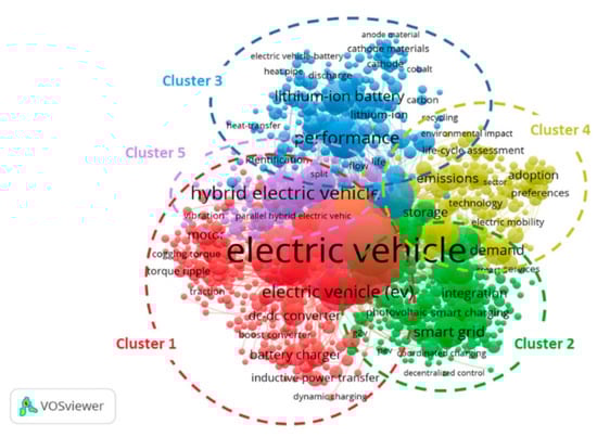 The keywords obtained were classified into five clusters. As expected, the most highlighted term, not only in cluster 1 but also across the entire network, is “electric vehicle”. The primary keywords represented in this cluster tend to focus on the EV traction system, such as, motor, traction, cogging torque, and torque ripple. In addition, the focus also covers the battery charging system, for example, DC–DC converters, battery chargers, and inductive power transfer. In cluster 2 the term that stands out is “optimization”. The main words in this cluster are related to the vehicle energy management system, such as systems, management, integration, and smart grid. In cluster 3 the highlighted term is “performance” and shows the main words related to the components of the lithium-ion battery, such as cathode materials and anode materials. In cluster 4, the terms related to environmental issues appear more frequently and includes emissions, demand, electric mobility, life-cycle assessment, and environmental impact. Last, in cluster 5, the biggest highlight term is “hybrid electric vehicle”.