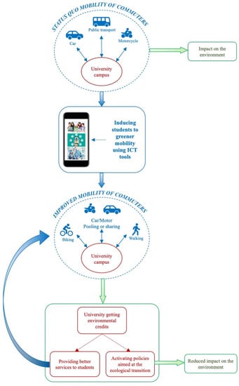In other words, a twofold goal is therefore pursued with this paper: on the one hand, to show the strong potential of an action regarding the change of students’ mobility habits (entailing the benefits previously described), and on the other hand, to propose to entitle universities to enter environmental credit markets. In particular, Section 2 addresses the application of a smartphone-app-based ICT method aimed at enhancing the sustainability of the commuter’s mobility, while Section 3 advances the hypothesis that the university could get environmental credits as a result of such a mobility-improvement initiative.