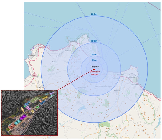 The Sicilian University of Palermo, encompassing 16 Departments, 134-degree courses and 23 Ph.D. courses, represents one of the largest Italian Universities, counting more than 42,000 enrolled students, with a rising trend in the last two years, and approximately 10,000 new freshmen in the 2020/2021 academic year only [56]. Most of the services offered by the University of Palermo take place on the campus sited in Viale delle Scienze, also known as “Cittadella” (meaning “small city”), given its large extension—about 37 hectares—characterized by the presence of large avenues and wide green areas and, in addition to that, various parking lots and buildings (Figure 2). Obviously, the circles in Figure 2 have the sole purpose of providing a draft visual representation of the distance between the different areas from which commuters originate and their target.