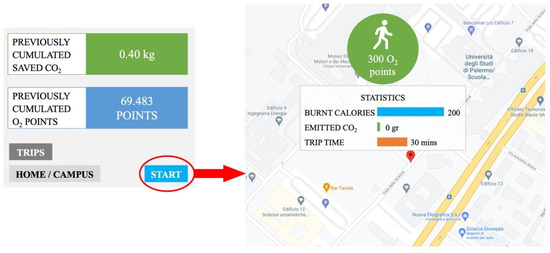 The user’s travel lengths and modalities (i.e., the way the user moves) are recorded and managed by using GPSs and accelerometers, sensors that are commonly present in smartphones and are able to detect the motion system with a high level of accuracy. A dedicated algorithm-based software that was trained by using a Fast Fourier Transform [76] was specifically designed for this purpose. Figure 3 illustrates screenshots of the software interface that appear to the users.