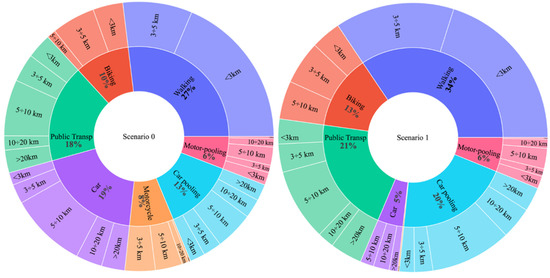 Aggregate percentages of kilometers covered by the mobility means in the actual ex-ante (0) and improved ex-post (1) scenarios, in reference to the total distance traveled by all commuters.