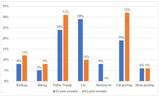 The comparison of Table 5 with Table 2 indicates a significant change in the modes of students’ travel to the campus as a result of the solicitations proposed by the app scheme. In addition, the aggregate percentage values, related to the modes of travel, indicate a considerable change in the performance of the mobility structure (see Figure 4 and Figure 5), which tends to favor the less impactful methods.
