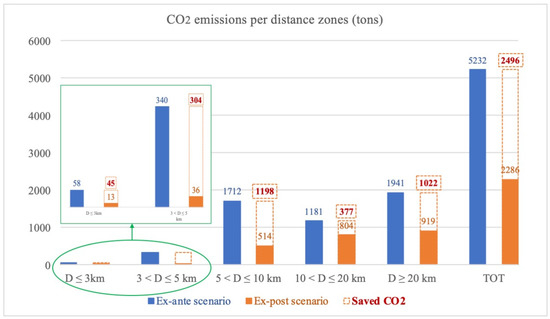 In Table 3, the high value of the total CO2 emissions of the commuters coming from the 5 ÷ 10 km distance area is caused by their mobility preferences, which are mainly oriented toward the private cars, and by the number of students pertinent to this area.