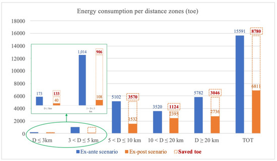 On the other hand, for the 25,000 students commuting to the campus from the periphery of Palermo (and its provincial territory), the pertinent energy required is equal to 15,591 and 6811 toe for the actual (ex-ante) and new improved (ex-post) scenarios, respectively. Such a significant enhancement, which consists in a reduction of up to 8780 toe, is highlighted in the graph shown in Figure 7. Data assumed for energy conversions through this study are 1 toe = 11,628 kWh for primary fuels (that is, 1 toe = 41.860 GJ) and 1 toe = 5347.59 kWh for electric energy (1 kWh = 0.187 * 10−3 toe).