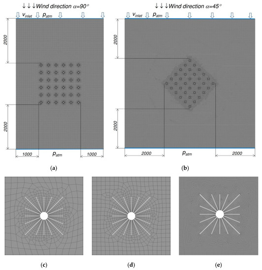 Figure 3. Mesh for wind direction of: (a) 90°, (b) 45°; Mesh detail around longitudinal finned tube for: (c) ref.1, (d) ref.3, (e) ref.4.