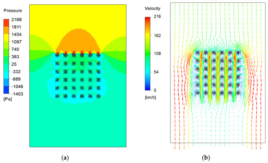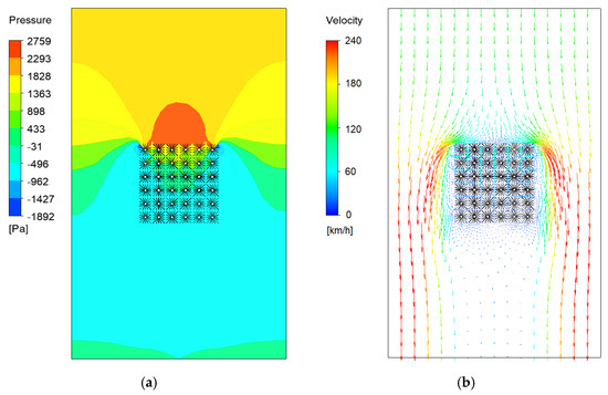 (a) Pressure distribution, (b) Velocity distribution (s = 500 mm, vinlet = 120 km/h, α = 90°).
