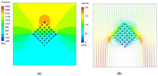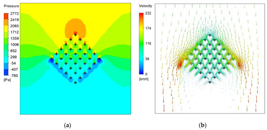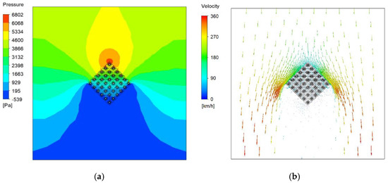 (a) Pressure distribution, (b) Velocity distribution (s = 500 mm, vinlet = 120 km/h, α = 45°).