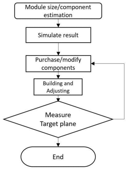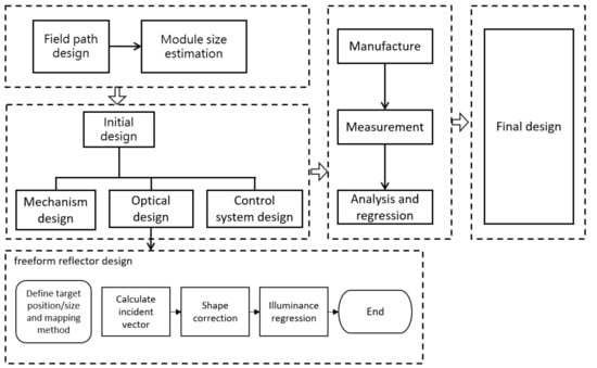 In this work, each light cube has three sub-designs at the same time: Mechanism design, optical design, and control design. These are combined to form light cubes with different functions as following: (1) a heliostat system; (2) a reflector system; and (3) an illumination system. The optical design was responsible for the light collection, light transmission, and light emission efficiency of the overall system. A design flow chart is shown in Figure 3. In relation to the addition of the freeform surface design, the optical design process was explained in Section 3.