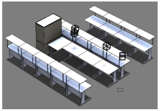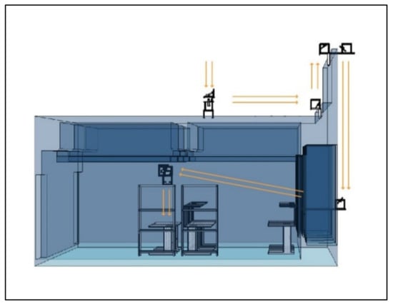 In planning the light path, the site selected for this work was the rooftop of the 2nd Teaching Building of the National Taiwan University of Science and Technology (NTUST; latitude: 25.0118° N, longitude: 121.5410° E) as the sunlight collection position, as shown in Figure 4. Figure 5 illustrates the indoor office space, which served as the target plane. Modeling software was used to build the field space to select the light path for detailed measurement and module efficiency evaluation. This helped us to select the least difficult construction method. We studied a site plan in Taipei to find a suitable location for the collector, so that it would not be shadowed by any obstructions and a light path with a minimum number of required reflections that would cause transport losses. A light path with great losses, due to multiple turns and excessively long distances, was not chosen. According to the analysis in SolidWorks, the best route was to pass through the outer wall and introduce sunlight from the window. The portable and adjustable system shown in Figure 6, with an optical path around , comprised five reflection points.