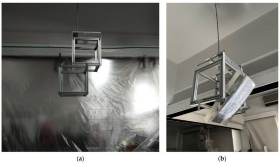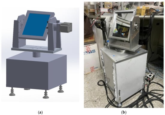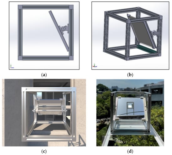 Based on the light cube infrastructure, the design of the heliostat light cube included a height adjustment and control system. The plan directly impacted the collection and transport performance of the heliostat. During the development process, if a collector with a high sunlight compression ratio was used, the coupling effect and the ratio between the guided light and the entrance light were critical. Furthermore, the material options also affected the manufacturing performance. Using wood with an aluminum-extruded base caused deviation, due to the module being overweight and a lack of structural strength. The heavy system meant that the motor was unable to achieve the deceleration effect, causing it to jitter. The mechanism also bent during repeated handling, forming a permanent deviation. Therefore, in the mechanism design, we removed the unstable factors from the coupling system and used CNC-machined stainless steel as the support material. The original predetermined size of 0.3 m × 0.3 m was equipped with a dual-axis motor and a dual-axis reducer in order to amplify the torque and increase the deceleration effect. The dual-axis system was fixed in the axis center of bearings. The whole mechanism adopted a portable and adjustable design to minimize the effect of the slightly uneven ground in the field. The simulation figure and the prototype module built with stainless steel are shown in Figure 9a,b.