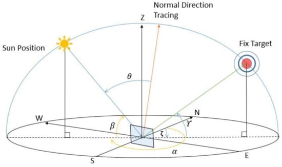 where is the sun’s azimuth, is the sun’s elevation, is the target’s azimuth, and is the target’s elevation for heliostats, as shown in Figure 10 [26]. The target was the following flat mirror. According to the normal vector of the heliostat, the pitch angle ME and azimuth angle MA can be calculated using Equations (4) and (5) [26]: