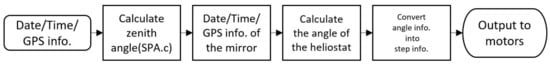 Therefore, the heliostat system used the GPS information of the flat mirror and the heliostat to calculate the pitch angle and the azimuth angle of the system’s motor by entering the date and the time through NREL’s SPA algorithm, as shown in Figure 10 [24]. Then, using the STM32F407 MCU by I2C, the two angles were converted to move steps for the motors, as illustrated in the flow chart in Figure 11. The design of the two-axis motor system took into consideration both the budget and demands. First, the MR-J3 10A and MR-J4 40A from Mitsubishi were used as servo motors, with APEX AE070 reducer motors to amplify the torque and increase the accuracy by 1:10. Second, HF-KP13J and HG-KR43J from Mitsubishi were used as servo motor controllers, using MR Configurator2 as the motor control software. We set the pitch angle and the azimuth angle accuracy to 36,000 steps. After passing through the magnification of the reducer, 360,000 steps were achieved, meaning the steps of the pitch angle and the azimuth angle reached a sun-tracking accuracy of 0.001°.