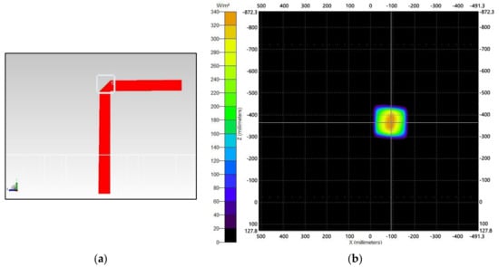 According to ISO 8995–Lighting of indoor workplaces, issued by CIE (International Commission on Illumination), the illuminance of the working area in an office should be greater than 200 lux. Figure 7a,b shows the element size simulation diagram and the light path simulation diagram, respectively. The target plane was set to be 0.9 m × 0.6 m. For reducing the cost and loss, we sought to minimize the coupling and reflecting points between the elements as much as possible.