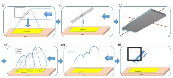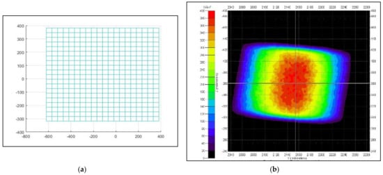 The incident light, the freeform reflector, and the target desktop are shown in Figure 13a. First, the three-dimensional coordinate system of the reflector was defined. Then, the distance between the illuminated surface and the freeform mirror was measured in order to determine the size and position of the illuminated surface using Equation (6), as shown in Figure 12b: