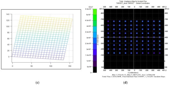 This section describes the simulated and measured results of the system. Figure 20a,b shows the system’s optical path from the heliostat to the desktop. The illumination map of the desktop was used to compare whether the reflector design was effective in correcting for the deformation. Figure 21a shows that the initial design had a clear cut-off, but the projection was distorted due to the rotation of the flat mirror. Although the efficiency was considered in the plan, the uniformity was not expected to form the shape of the illuminated area. Therefore, the steps of the optical design corrected the deformation. The nonuniform energy distribution could be fixed through the polynomial regression shown in Figure 21b,c. The nine-point measurement method stipulated in the indoor lighting secification (CNS 14335) was applied to measure the uniformity of the illuminated area. The distance to the edge of the bright region was marked as 10% and the interval was 40%, as shown in Figure 20c.