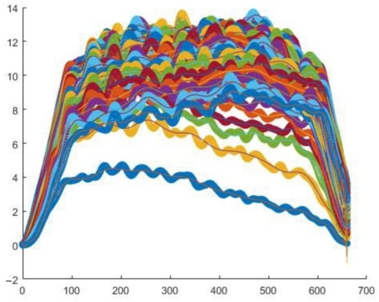 When the light was transmitted through several flat mirrors, each rotation’s projection caused some energy loss and some shape deformation, as shown in Figure 14. In the process of the freeform design, the rectangular target plane, as shown in Figure 15a, caused the shape of the illuminated area to be tilted and become asymmetric, as the incident beam was nonrectangular, as shown in Figure 15b. Therefore, the second design of the freeform surface used an asymmetrically illuminated distribution to correct this problem. First, the sunlight simulation results on the target plane, as shown in Figure 16, were fed back into MATLAB. Then, the target plane was cut into b equal parts along the y-axis, and the integral results were obtained, as shown in Figure 17. Regressions were performed to correct the shape of the light spot and the form of energy distribution in order to achieve a uniformly illuminated area. Figure 15c shows the asymmetric target plane, and the corrected illuminated area is shown in Figure 15d.