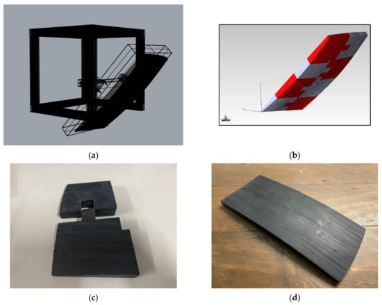 The reflector module combined the designed freeform component with an acrylic backboard, as shown in Figure 18a, replacing the original flat mirror mechanism. Although the fabrication of a freeform reflector required high accuracy, the original freeform reflector was cut into eight pieces for manufacturing, as shown in Figure 18b, in order to meet the limitations of consumer 3D printing machines. Light-curing 3D printing was used for printing, and the finished products are shown in Figure 18c,d.