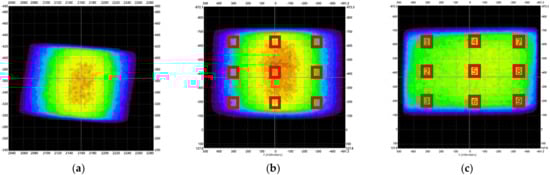 Illuminance map of the target plane before any correction (a), with an incident plane shape correction only (b), and with a shape correction and an illuminance regression (c).