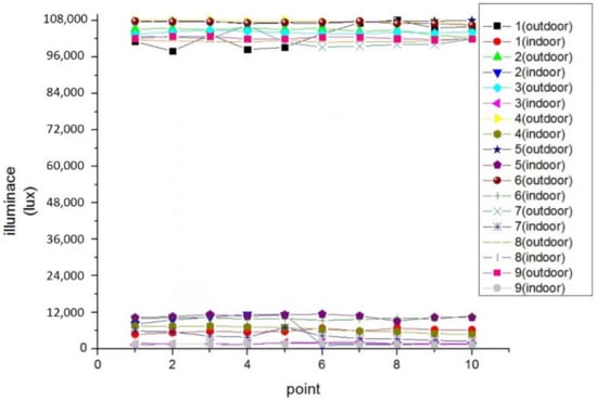 The whole system was built in the 2nd Teaching Building of NTUST. The verification time for the fabrication results was from 12:20 to 13:00 on 30 April 2021. According to the location and the season, the sunshine duration was 13 h and 5 min. Each measurement was completed within 4 min, as the incident angle of sunlight took about 4.6 min to change 1°. Each of the nine indoor and nine outdoor points was included, and Table 1 shows the average of 10 measurements. The results are shown in Figure 22 and Figure 23, comparing the outdoor and indoor illuminances.