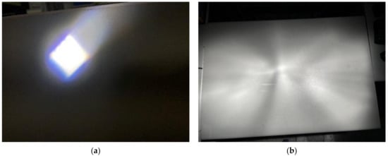 Vacuum plating consisted of a physical vapor deposition on a surface with a metal material. The light-curing material was liquid composite resin, which did not meet the reflection expectation of this research. Therefore, the parts of the freeform reflector were glued and then coated with a highly reflective aluminum layer through vacuum plating. We used two different kinds of glue to ensure the adhesive’s firmness and temperature resistance. The finished product is shown in Figure 19.