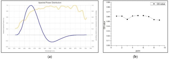 In addition to the illuminance, whether the circadian stimulus (CS) value can be achieved or exceeded is also believed to be an essential indicator [27]. Compared with modern artificial lighting, daylight can provide a higher CS value and help the human body during daytime work. Therefore, it is recommended that the CS value should be higher than 0.35. After collecting the spectrum at each measurement point, as shown in Figure 25a, the yellow curve is the spectrum under the test environment, and the indigo curve is the corresponding light intensity of the CS with the CS values of the nine points determined, as illustrated in Figure 25b. The maximum CS value was 0.689, the minimum value was 0.586, and the values were between two standard deviations. Therefore, according to the results, the recommended value for high stimulation was met at each point.
