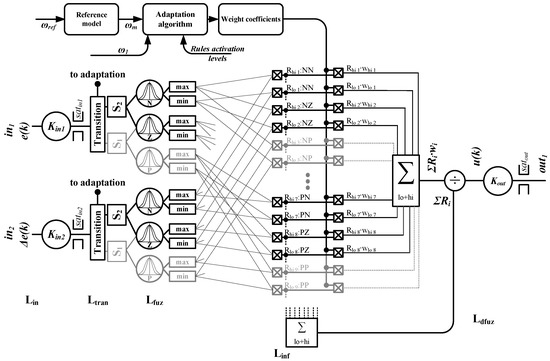 In each iteration, adapted weight coefficients are changed by a values dependent on the current model tracking error. Only coefficients corresponding to active rules are adapted proportionally to the level of corresponding rule activation. Weight coefficients should be limited in such a way as to allow to reach the maximum desired output signal value. A description of the control structure with reference model is also presented in [46,47,48,49]. The adaptation parameters (kem, kΔm) are tuned using algorithm described in Section 4.1.