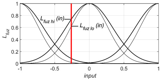 There are various types and shapes [38,39,40,41,42] of membership functions (MF) used at the fuzzyfication layer. In this paper the type II Gaussian MF with uncertain standard deviation [43,44,45] has been proposed. The standard type I Gaussian function is defined by Formula (2). Using type II fuzzy membership functions, for each input value, the output value is described as range. As Figure 3 shows, the output range of the II type membership function is limited by the maximum and minimum value of possible outputs. Thus, for the whole input value range, the output is limited by the values defined by upper and lower boundaries of Gaussian function. The standard deviation is different and the centre () of both functions is same. Therefore the output of fuzzyfication layer is a matrix of n × m × 2 (2: lower and upper boundaries of type II MF).