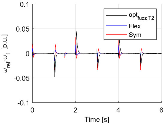 As can be seen in Figure 9, the PI controller tuned in accordance with the symmetry criterion gives the highest value of the speed error at the moment of switching the load on, additionally the response is characterized by swing. In the case of Flex (blue) settings, a significant improvement can be seen, however, the use of a fuzzy controller with type I membership functions gives an even better quality of response. The oscillatory nature of the speed response ω1 appears, however, in the load speed ω2, there are no oscillations. This is confirmed by the analysis of the error ω1.
