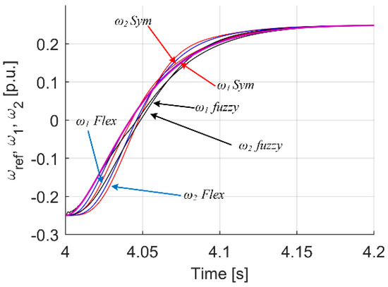 Looking at Figure 11, it can be seen that the smallest maximum difference between the speed ω1 and ω2 is given by the Flex tuning of the PI controller. A slightly larger difference is offered by the fuzzy regulator, and the smallest, although the differences are minimal, is provided by the tuned Flex regulator. Later in Figure 12, Figure 13 and Figure 14, the transients involved by change of reference speed are shown. Here, too, we can see analogous behavior of a bend, but the time of the dynamic state is relatively longer, so the real differences between the systems are also slightly more significant.