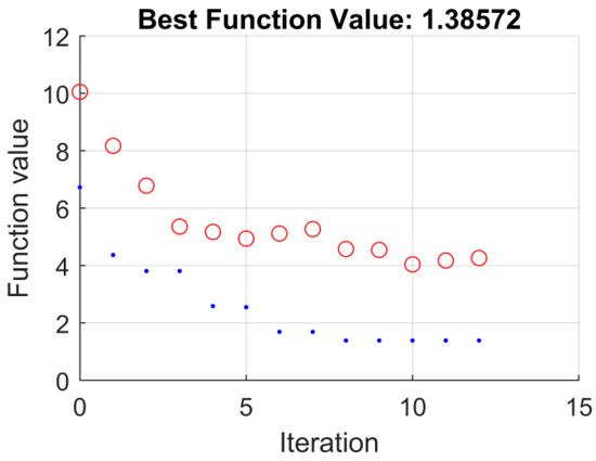 As an optimization algorithm the Particle Swarm Optimization (PSO) [55,56,57] was used. The swarm size was set as 20. Function tolerance 1 × 10−4. Inertia Range [0.1, 1.5]. Initial swarm span (default) 2000, max iterations (200) was never reached. The maximum number of stall iterations (5), combined with function tolerance were always the reason to stop the algorithm. There were no time constraints. The minimum adaptive neighbourhood size is 0.25. Self-adjustment as well social adjustment of weight was 1.49. Other not-mentioned options are set as default. All the above options are common for all optimizations. The search boundaries and number of optimized variables are only variable parameters.