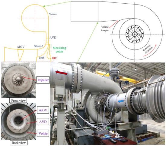 The first stage large-size centrifugal compressor in the multi-stage intercooling closed test facility is selected as the research object in the present study. The schematic diagram of the geometric structure and the physical drawing of the corresponding castings on-site are shown in detail in Figure 1, whose main flow components consist of 12 adjustable inlet guide vanes (AIGVs), 13 unshroud impeller blades, 11 low-solidity adjustable vaned diffusers (AVDs) and a circular external volute with tangential inlet. IBC structure is a very irregular cavity surrounded by the impeller disk, the casing, the rotating shaft and the sealing structure (ignored in Figure 1), because such a weight reduction casting can save input power considering from the perspective of rotor dynamics. The upper and lower interfaces of IBC are respectively connected to the gap between impeller and AVDs, and the carbon ring seal and the oil seal (showed in Figure 3b). The sealing effect is so good that the leakage relative to the mainstream is negligible. The design parameters of the compressor are as follows: total inlet pressure 97,000 Pa, total inlet temperature 303.15 K, design mass flow (m) 34 kg/s, design rotating speed (n) 8658.7 r/min, total pressure ratio (PRt) 2.29 with consideration of volute. Main structural parameters of mainstream components such as impeller, AVDs, IGVs and volute are fully listed in Table 1.