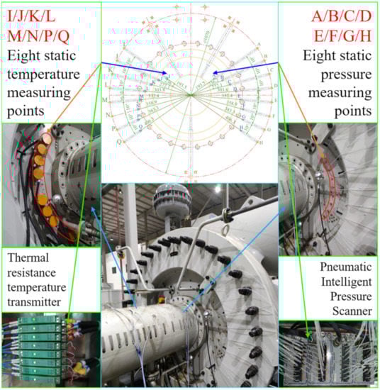 All experimental procedures were completed on the closed test rig of the large-scale CAES multi-stage intercooling centrifugal compressor in National Energy Large-Scale Physical Energy Storage Technologies R&D Center (IET, CAS). The entire facility has strong capabilities with a 0.5~110 bar pressure measurement range, 0~40,000 r/min speed measurement range, and 0~10 MW power measurement range. More detailed information about the experimental compressor can be retrieved from previous research [25]. The radius distribution of all measuring points on the static wall surface of IBC is determined by the equivalent area ring method. As shown in Figure 2, the eight ps measuring points and eight Ts measuring points are densely arranged on the left and right sides respectively, and the radii of the specific positions are 193.5 mm, 236.2 mm, 272.1 mm, 303.8 mm, 332.4 mm, 358.9 mm, 383.3 mm, and 406.3 mm. All 16 measuring points are respectively led out to the circumference of the casing wall with a radius of 535 mm (surrounded by the red circle in Figure 2) through the corresponding internal channels. The static pressure of the 8 marked points A, B, C, D, E, F, G, and H on the right side of the cavity is transmitted to the remote PSI pressure scanning system through the white pressure tube after passing through the internal flow channel. The static temperature signals of the 8 marked points I, J, K, L, M, N, P, and Q on the left side of the cavity are converted into electrical signals by the thermal resistance sensor lead wires arranged in the internal flow channel, and then it is amplified and transported to the host computer by the temperature transmitter.